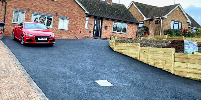 For this project in the Lenches, near Evesham, Henson Surfacing were commissioned to install a new tarmac driveway incorporating oak sleeper retaining walls.