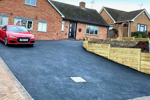 Tarmac Driveway with Oak Sleeper Retaining Walls – The Lenches, Near Evesham